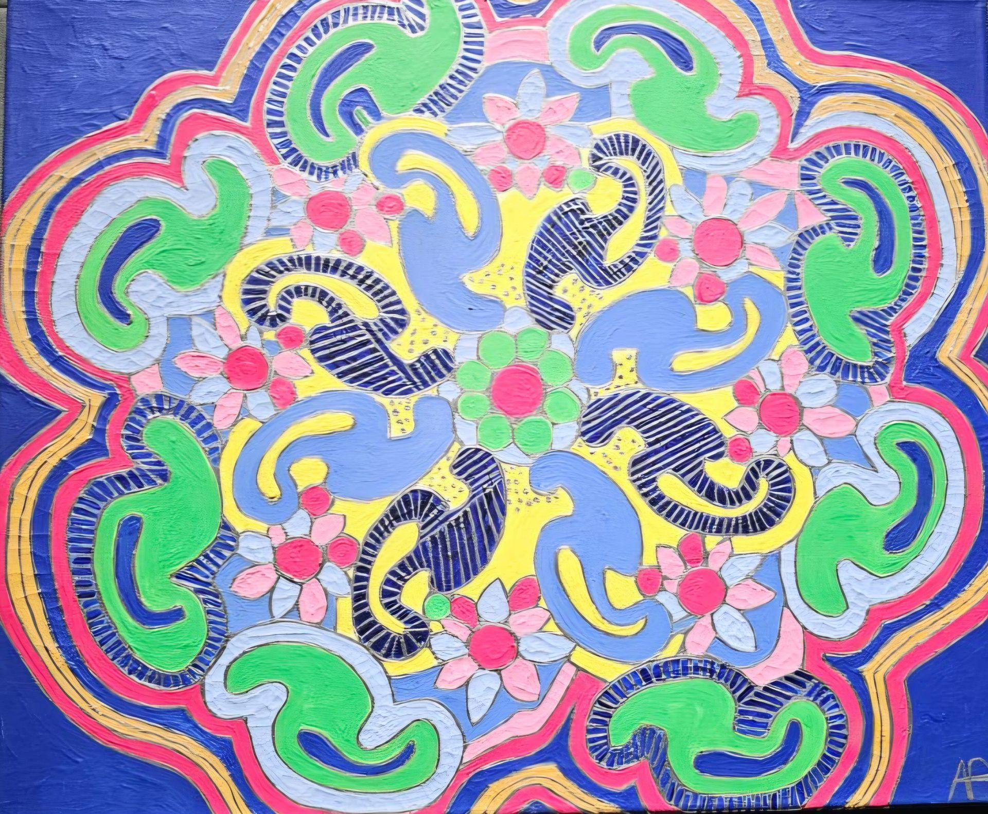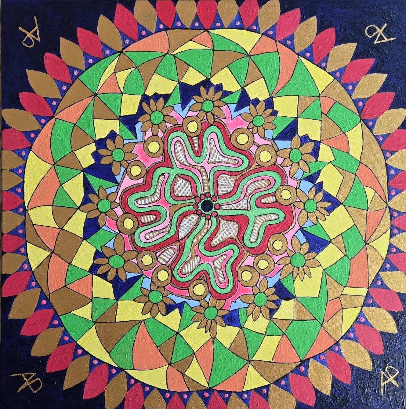 Im Zentrum entfaltet sich eine organische Blütenform, umgeben von kleinen Blumen, Kreisen und facettenreichen geometrischen Segmenten. Leuchtende Farben und blattartige Formen im Rand schaffen ein harmonisches, lebendiges Mandala voller Detail.