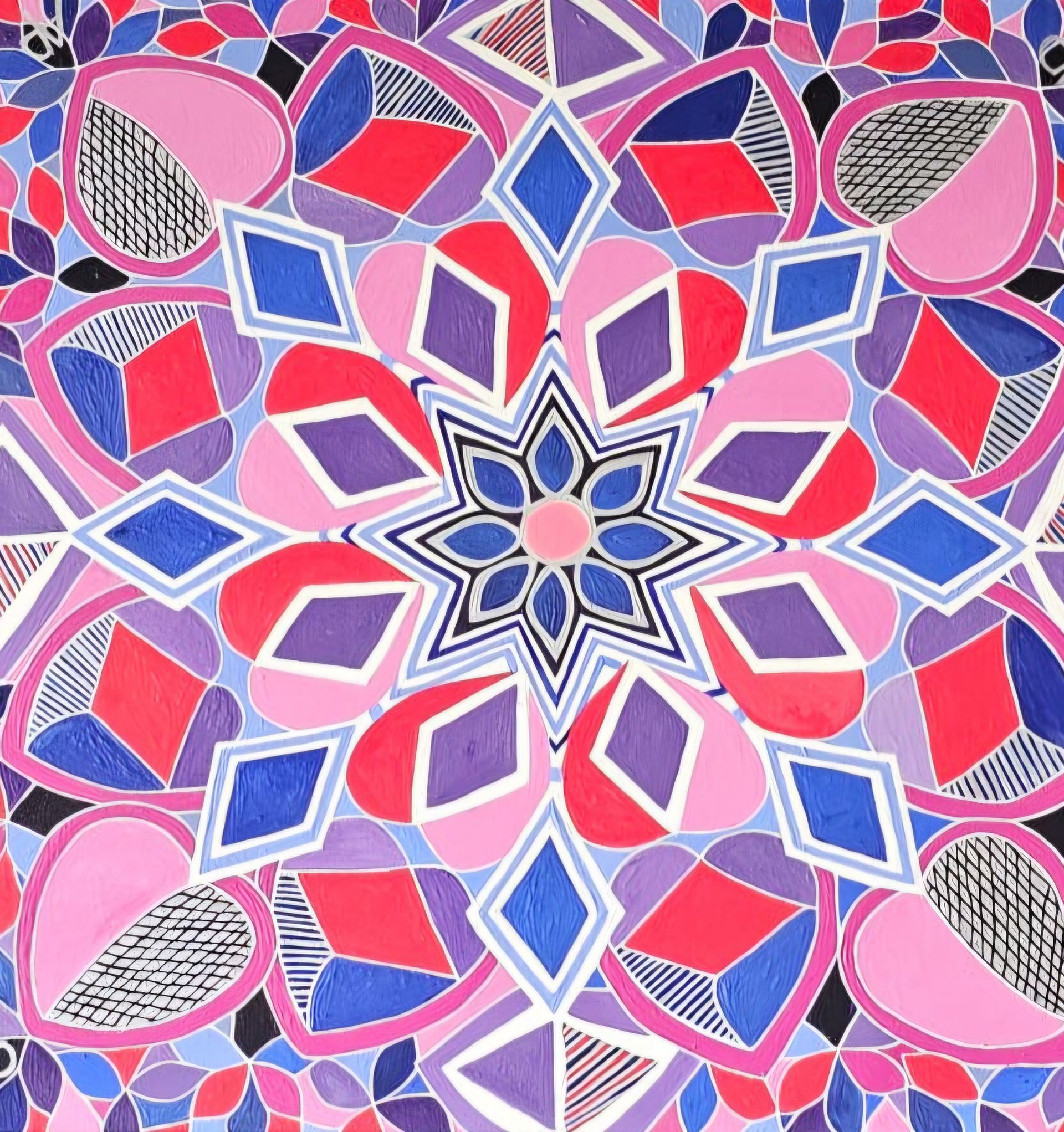 Leuchtende Farben und klare Symmetrie formen ein Mandala voller Energie. Zwischen warmem Rot, sanften Rosatönen und kühlem Blau entsteht ein harmonisches Spiel aus Struktur, Bewegung und innerem Gleichgewicht.
